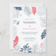 Blå vita och korallröda tropiska blommor och löv elegant bröllop ram. Elegantens moderna utformning.