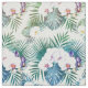Elegant, exotiska orkidéer och tropisk löv på vit bakgrund, klar botanisk blommigt, handflatan löv, monstera löv, ananaslöv, Hawaiisk design. Blåblått, ljusblått, orange, grönt, ljust grönt, gult, brunt, grått och vitt färg. Detta trendig, Snyggt, bohemi, tropiska motiv är perfekt för vardaglig bära eller hemmabruk. En unik bild av sommaren, sol, stranden, feminin, glamor.