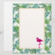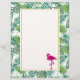 Ballhuvud med grönt tropiska löv mönster och vit ram med guld gräns överst. En rosa flamingo-illustration tillför lite charm.