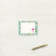 Fästande anteckningar med en grönt tropiska löv mönster och ett vitt ram med ett guld gräns överst. En rosa flamingo-illustration tillför lite stollig.