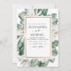 Tropiska Magnolia Flowers med Blommigt Greenery Handflatan och Faux Gold Foil Geometric Gräns Vår eller Summer Wedding Invations - innehåller vackra och elegant manustypografi med moderna tropiska botaniska blommor och grönenergi för den speciella Bröllopsdagen firande.
