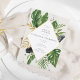 Den här bröllopsinbjudan innehåller grönt vattenfärgstropiska handflatan, banan- och monstera-löv och simulerad guld blad. Det har en matchande mönster tillbaka. Trendigets geometriska bakgrunder med hexagoner, cirklar och diamanter med simulerat guld accent gräns. Den här samlingen har bröllopsinbjudningar, spara datumet, svps, menyer och etiketter. Underbar för sommar, destination och strandbröllop!