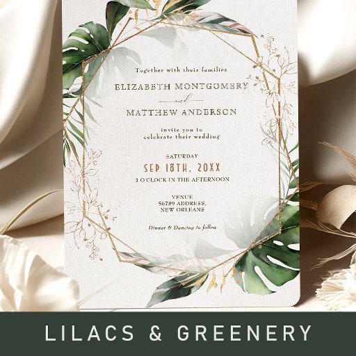 Tropiska Monstera Guld Grönt Watercolor Bröllop Inbjudningar