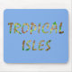 Mosaik, grafisk text, "Tropiska öar" som betyder en fiktiv, fantasifull plats - visad i ett exotiskt, ö-mönster av; orange, olivgrön, gul, taupe, brun, svart och vit.