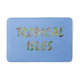 Mosaik, grafisk text, "Tropiska öar", vilket innebär en fiktiv, fantasirik ställe som visas i exotisk, öisk mönster av: orange, olivträd, grönt, gult, taupe, brun, svart och vit.