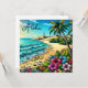 Aloha! Söt tropisk kuststrand. Söt blå vatten, handflatan träd, tropiska blommor och fyr i bakgrunden. Ai-konst gjord i tecknad bok pop art stil.