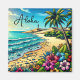 Aloha! Söt tropisk kuststrand. Söt blå vatten, handflatan träd, tropiska blommor och fyr i bakgrunden. Ai-konst gjord i tecknad bok pop art stil.
