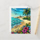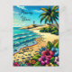 Saknar dig på semestervykortet. Söt tropisk kuststrand. Söt blå vatten, handflatan träd, tropiska blommor och fyr i bakgrunden. Ai-konst gjord i tecknad bok pop art stil.