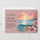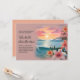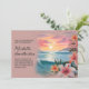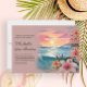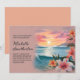 Kvinnlig födelsedagsfest inbjudan med akvarellmålning av en vacker solnedgång på en strand täckt med tropiska palmer och blommor.
