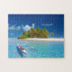 Det här pusslet har en bild av en exotisk tropisk ö, sandstrand, handflatan träd och kristallklar vatten.