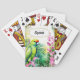 En tropiskt inspirerad, djungelbakgrund fylld med blommor av vattenfärgad rosa blommar och en färgstark grönt och orange parakeet sitta bland grönare och rosa i vild. En scallop vit med etiketten faux guld visas längst upp på vilken mallar för ditt anpassningsbar monogram, initialer och namn går. Dessa är idealiska som stuffare eller som gåvor till möhippa- och kortspelsentusiaster.