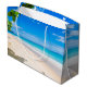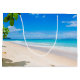 Gråväska med ett fint foto. En vit sandstrand med azurblått vatten. Lättare bild med en solig himlar och mjuk skumbildande surfa med söta tropiska löv som ramar in bilden.