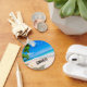 En nyckelkedja med ett vackert foto. En vit sandstrand med azurblått vatten. Lättare bild med en solig himlar och mjuk skumbildande surfa med söta tropiska löv som ramar in bilden.