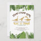 Massa fötterna och ge en ROAR, det är en dinosaur party! Konstruktionen har en redigerbar "stomp-roar" och guld glitter-dinosaur omgiven av tropiska gröntar av skog av löv.