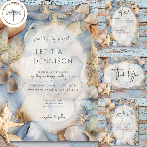 Tropiska snäckskal scen Modern bröllop Spara Datumet