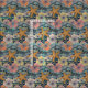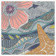 Tropiska hibiskusblommor, sjöstjärna och vågmönster, ursprungligen ritade med bläck. Finns i earth, iron, mullbär och navy.