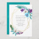 Färgfulla vattenfärgstropiska löv och orkidébröllop med guld geometriskt ram och turkosa blå vattenfärg tvättar omvänt.
