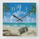 Beach house-klocka med en tropisk bakgrund. Anpassa till namn och etablera år.