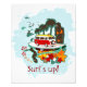 En roligt och modern illustration av en tropisk strandscen med handflatan träd, oceanernas surfa med surfare, en vacker bikinisk klad kvinna, vackra blommor och en gammal hippy van buss. Underbar design för stranden älskare.
