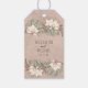 Tropical Beach White Orchid Blommigt Handflatan Foliage Gift Märkre. Ytfärger som målats av en internationellt licensierad konstnär och produktdesignern Audrey Jeanne Roberts. Elegant, mjölig ört färg-palett av Boho torkade handflatan och Monstera greenery parad med mjuka vita orkidéer för en klassisk öken eller bröllop. Copyright.