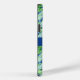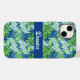 Vackra tropiska löv och handflatan fronder i skuggor av grönt, på royalets blå bakgrund skapar ett strålande och lyxigt telefonfodral. Ett blått band, i samma skuggning som bakgrunden, innehåller ditt namn i blekens grönt.