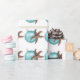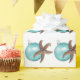 Tropisk julklapp. Kvalitetsförpackning papper på en rulle med blått och brunt, stjärnfisk och ornament mönster på vit papper. Beach themed färg för ett kustnära firande.