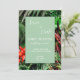 Modernt designad bröllopsinbjudan med olika tropiska växter och rika färger som ramar in det viktiga evenemanget. Ett tropiskt foto för ett tropiskt bröllopstema, vare sig det är lokalt eller på en tropisk destination.