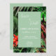 Modernt designad bröllopsinbjudan med olika tropiska växter med rika färger som ramar in evenemangets betydelse. Ett tropiskt foto för ett tropiskt bröllopstema, oavsett om det är lokalt eller en tropisk destination.