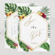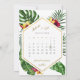 Spara datum-kort med tropisk design, tropiska blad, gula och röda blommor, gyllene geometriska former och kalligrafi. Lätt att anpassa kalender på baksidan där du också kan markera ditt datum med ett litet tropiskt blad.