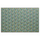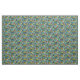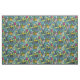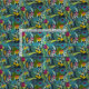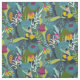 Ett starkt tropiskt blommönster i blå, grönt, guld och rosa.