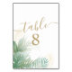 Tropiskt tematiskt originalteckning på vit bakgrund. Den har stora löv och monster i handflatan i en rad gröntar med tillägg av konturer och bokstäver i guld. Du behöver bara ändra numret, lägg till i kundvagn. Upprepa sedan detta för så många bordsnummer du behöver.