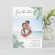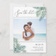 Meddela din sommar-, destination- eller strandbröllop med den här tropiska chicen spara datumkorten med ditt favoritfoto eller ett landskapsinriktat foto. Tropiska handflatan-löv i vattenfärgen grönt visas i hörnen med "spara datumet" och dina bröllop-detaljer i en elegant-blandning av skript- och serif-typografi.