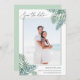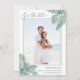 Meddela din sommar-, destination- eller strandbröllop med den här tropiska chicen spara datumkorten som innehåller ditt favoritfoto med lodrät eller porträtt. Tropiska handflatan-löv i gröntens vattenfärg visas i hörnen, med "spara datumet" och dina bröllop-detaljer i en elegant blandning av modernt handskript och traditionell serif-typografi.