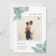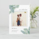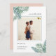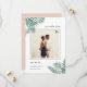 Meddela din sommar-, destination- eller strandbröllop med den här tropiska chicen spara datumkorten med ditt favoritkvadratfoto. Tropiska handflatan-löv i vattenfärgen grönt visas i hörnen med "spara datumet" och dina bröllop-detaljer i en elegant-blandning av skript- och serif-typografi. Kort går tillbaka till solid rosa för ett modernt och summerittropiskt utseende.