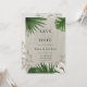 Meddela din stora dag med detta eleganta tropiska gröna Spara datumet-kort. Med frodiga palm- och monstera blad och mjuka blomsteraccent, är denna design perfekt för ett destinationbröllop eller ett modernt botaniskt tema. Personliggör enkelt med era namn, datum och plats för att göra det till ert eget.