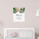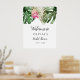 Modern välkomstskylt för bröllopsdusch med akvarellillustration av monstera blad, palmblad och rosa kung protea blomma. Perfekt för din sommarfest.