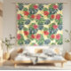 Ett glatt rött och rosa blommönster med stor grönt och blå monstera löv mot en mjuk gult bakgrund.