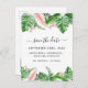 Den tropiska Grönten Handflatan Löv och den Blommigten Rosa Flowers Watercolor Vår eller Summer Bröllop spara datum - innehåller vacker och elegant manustypografi med moderna tropiska botaniska blommor och grönenergi för den speciella Bröllopsdagen firande.