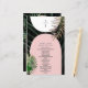 rosa och vita bågar över mörk handflatan löv med lodrät monogram på bilder av handflatan och löv i överkant och vattenfärg. Baksidan har handflatan löv-teckningar med bågar och grått-text.