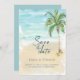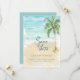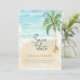 Beach-temat bröllop spara datum-kort har ett vattenfärgshav, sand och sjölandskap i handflatan träd. Perfekt för bröllopsteman för strand, tropiska ämnen, öar och destinationer. Originalteckningen KL Lagrar