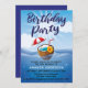 Inbjudan till 30-årsfest. Tropiskt tema, design med inslag av hav och flytande kokosdrink.