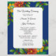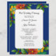 Ett litet program för bröllopsceremoni på stranden med tropiskt jultema. Färg i marinblått med hibiscus och löv i holly. Enkelt, ensidigt program med fyra ställe för att anpassa texten. Mörk blått färg är lätt att ändra i området "anpassa ytterligare". Stora hawaiiska blommor med grönt som är helt i bakgrunden.