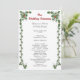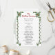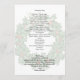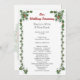 Platt bröllopsceremoni-programmall med en tropisk, juldesign. Vita sjöstjärnor och grön järnek pryder framsidan med svart tryckt text. En krans är bilden på baksidan, med en plats för paret att skriva ett meddelande till gästerna.