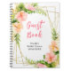 Denna vackra och eleganta bröllopsfest gästbok har akvarell rosa och orange hibiskus blommor och blad på en guld geometrisk ram. Texten kombinerar handskriven skrift och serif teckensnitt för en stilren och modern look. Detta är perfekt för en sommar tropisk bröllopsfest.