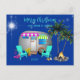 Kampanjtemat, julvykort hälsning. En liten silver-videokamera är en design som är lätt att anpassa vykort. Handflatan träd är dekorerat med ljus och två blå turkostolar inrättas av campfire, medan stjärnorna lyser i himmel. Flamingos och ett årstidsskal kompletterar den tropiska utformningen. Ta med ett utskick adress på baksidan om du vill. Varje vykort måste anpassas separat för adress. Ett kort har lagts till i din kundvagn, klicka på det om du vill gå tillbaka till produktsidan och anpassa nästa.
