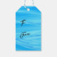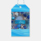 Jul vid havet! Lägg till den här fantastiska kustinspirerade märkrn till ditt tropiska tematiska helgdag paket. Fotobilden på presentens märkre innehåller stjärnfisk, strimlad fisk, seahorse, klam-snäckor, korall och bollar för prydnadsföremål i olika nyanser av silver, blått och vitt. På plaketten står det "Seas 'n Hälsning". Gift-märkre som säljs i satser om 10. Fotografi av Glenda Motsavage, en Florida-baserad resekoramatör och författare. Bild från Orlando Museum of Art, festival av Träd.