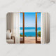 Öppna dörr med vita gardiner och trä utomhus som ser över en tropisk scen.