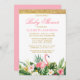 Modern Tropical Blommigt Baby Shower-inbjudan med Rosa Flamingo. Rosa och Guld. Guld Glitter överst.