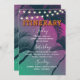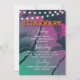 Tropisk tidslinje nattetid med tropisk utformning, sträng ljus, handflatan träd och grönt och lila himlar.