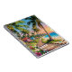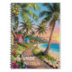 En vacker personlig anteckningsbok med en illustration av en strandpromenad längs kusten i ett tropiskt paradis vid havet, med palmer med kokosnötter och strängar av små lampor, blå havsvågor och små fantasifulla stugor.